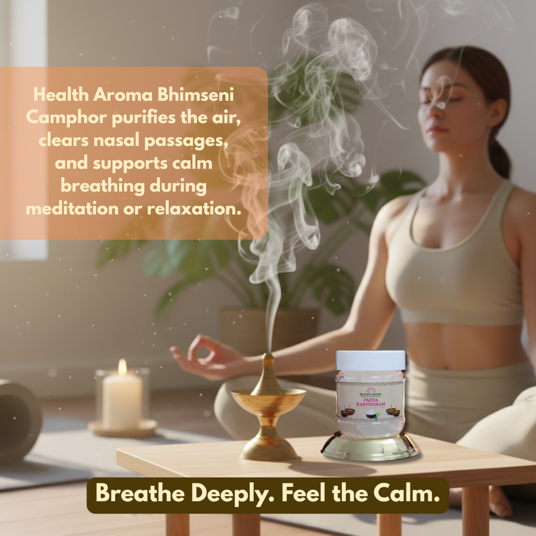 Health Aromaโs Bhimseni Camphor (Pachakarpooram) is 100% pure, natural, and crystal-clear โ derived from the Cinnamomum Camphora tree. This ancient Vedic purifier cleanses your surroundings, uplifts your mood, and refreshes your home with divine fragrance.