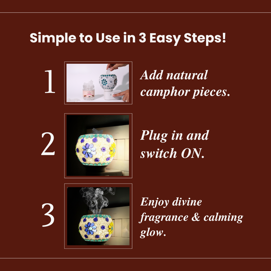 Bring home purity, peace, and beauty with our 2-in-1 Night Lamp & Aroma Diffuser. The vibrant Blue Floral Mosaic glows softly while spreading the natural fragrance of Bheemseni camphor.