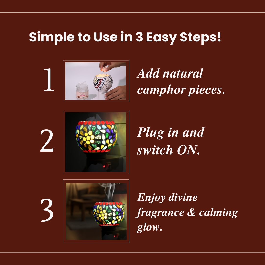 Bring home purity, peace, and beauty with our 2-in-1 Night Lamp & Aroma Diffuser. The vibrant multicolor leaf mosaic glows softly while spreading the natural fragrance of Bheemseni camphor.